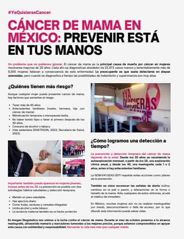 La prevenci%u00f3n y detecci%u00f3n temprana del c%u00e1ncer de mamadepende de la edad. Desde los 20 a%u00f1os se recomienda laautoexploraci%u00f3n mensual; a partir de los 25, una exploraci%u00f3ncl%u00ednica anual; y desde los 40, una mastograf%u00eda cada 1 o 2a%u00f1os, antes si hay antecedentes familiares.La NOM-041-SSA2-2011 respalda estas acciones como pilaresde la prevenci%u00f3n.Tambi%u00e9n es clave reconocer las se%u00f1ales de alerta: bultos,cambios en la piel o pez%u00f3n, y alteraciones en la forma otama%u00f1o de la mama. Ante cualquiera de estos s%u00edntomas, acudeal m%u00e9dico de inmediato.En M%u00e9xico, muchas mujeres a%u00fan no se realizan mastograf%u00edaspor miedo, desconocimiento o falta de acceso, por lo quedifundir esta informaci%u00f3n puede salvar vidas.%u00bfC%u00f3mo logramos una detecci%u00f3n atiempo?Aunque cualquier mujer puede presentar c%u00e1ncer de mama,hay factores que aumentan el riesgo:Tener m%u00e1s de 40 a%u00f1os.Antecedentes familiares (madre, hermana, hija conc%u00e1ncer de mama).Menstruaci%u00f3n temprana o menopausia tard%u00eda.No haber tenido hijos o tener el primero despu%u00e9s de los30 a%u00f1os.Consumo de alcohol o tabaco.Vida sedentaria (ISSSTESON, 2023; Secretar%u00eda de Salud,2023).Un problema que no podemos ignorar. El c%u00e1ncer de mama es la principal causa de muerte por c%u00e1ncer en mujeresmexicanas mayores de 20 a%u00f1os. Cada a%u00f1o se diagnostican alrededor de 23,873 casos nuevos y lamentablemente m%u00e1s de8,000 mujeres fallecen a consecuencia de esta enfermedad. Lo preocupante es que suele detectarse en etapasavanzadas, pero cuando se diagnostica a tiempo las posibilidades de tratamiento y supervivencia son muy altas.#YaQuisierasCancer%u00bfQui%u00e9nes tienen m%u00e1s riesgo?C%u00c1NCER DE MAMA ENM%u00c9XICO: PREVENIR EST%u00c1EN TUS MANOSImportante: tambi%u00e9n puede aparecer en mujeres j%u00f3venes,incluso antes de los 30. La prevenci%u00f3n es posible con dosestrategias: h%u00e1bitos saludables y detecci%u00f3n temprana.Mant%u00e9n un peso saludableHaz ejercicio diarioCome frutas, verduras y cereales integralesLimita alcohol y evita tabacoLa lactancia materna tambi%u00e9n es un factor protectorEn Imagen Diagn%u00f3stica nos unimos a la lucha contra el c%u00e1ncer de mama. Durante el mes de octubre ponemos a tu alcancemastograf%u00eda, ultrasonido mamario y marcadores tumorales a los mejores precios, porque estamos comprometidos en apoyaresta causa con solidaridad y responsabilidad. Recuerda: tu vida vale m%u00e1s que cualquier miedo.